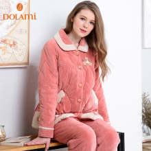 多拉美冬季女士三层珊瑚绒夹棉睡衣女冬加厚法兰绒夹棉家居服套装