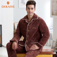多拉美睡衣男冬季加厚加绒珊瑚绒夹棉睡衣男士三层夹棉家居服套装