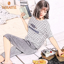 多拉美睡衣女士夏季纯棉薄款条纹短袖七分裤五分裤家居服中裤套装