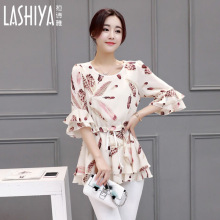 2017夏季新款女装荷叶袖雪纺衫收腰显瘦印花中长款短袖小衫防晒衣