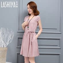 棉麻连衣裙夏中长款2017韩版宽松显瘦收腰大码女装短袖a型亚麻裙