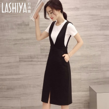 女装夏装2017新款潮背带裙修身中长款两件套装连衣裙白色短袖T恤
