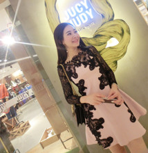 2017春装新款名媛风气质勾花镂空蕾丝拼接A字裙修身显瘦连衣裙女
