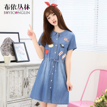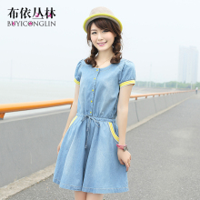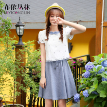 布依丛林2017夏装新款韩版收腰显瘦学生中长款少女短袖牛仔连衣裙