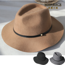 百搭铆钉皮绳宽檐进口羊毛呢礼帽韩版潮黑驼色女帽子士秋冬天保暖