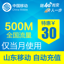 山东移动流量充值 500MB 全国2G/3G/4G通用 手机流量包 自动充值