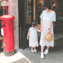 亲子装夏季女童装母女装 女宝宝女婴儿夏装短袖蕾丝连衣裙2件套装