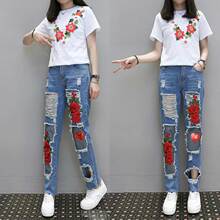 民族风套装2017夏季新款刺绣花T恤+刺绣花破洞牛仔裤女潮两件套