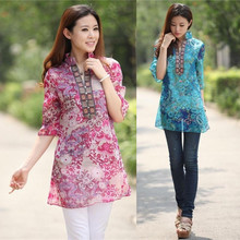 夏季民族风雪纺衬衫大码加肥女士中袖中长款碎花上衣宽松衬衣