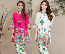 15夏民族风棉麻绣花女装连衣裙刺绣唐装宽松七分袖中长上衣打底衫