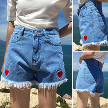2017夏季新款韩版高腰毛边流苏爱心刺绣牛仔短裤女 显瘦显高 热裤