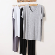 短袖长裤 男士睡衣夏季男家居服夏 莫代尔V领套装外贸薄款居家服