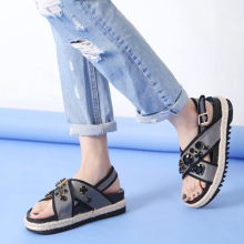 韩国代购2017夏休闲凉鞋女时尚水钻装饰松糕厚底防滑草编麻绳平底