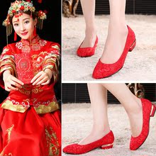 秀禾鞋中式婚鞋女粗跟平底婚礼红鞋新娘鞋红色平跟孕妇大码结婚鞋
