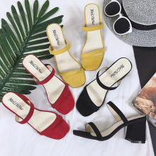 2017夏季新款韩版简约高跟粗跟细带凉拖鞋方头露趾懒人一字沙滩鞋