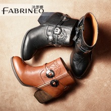 法蒂娜2016中筒靴欧美靴子牛皮高跟粗跟女靴新款马丁靴打蜡靴子女