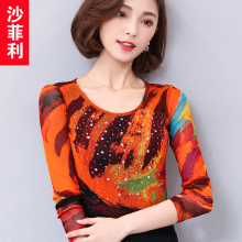 小衫2017春季新款 修身圆领烫钻长袖网纱印花打底衫上衣女大码T恤