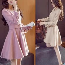 春款2017中长款韩版女装气质修身毛呢连衣裙显瘦长袖a型短款裙子