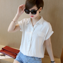 2017韩版新款棉麻白衬衫女显瘦百搭翻领亚麻衬衣短袖女装宽松上衣