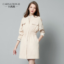 卡芮茜 中长款风衣女修身2017春季新款前拉链通勤圆领外套女装