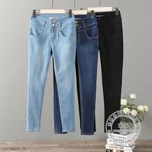 欧美范高腰两扣弹力修身显瘦水洗磨白小脚牛仔裤长裤子