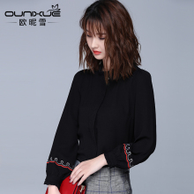 欧昵雪2017春装新款OL气质简约女装衬衣时尚刺绣翻领长袖衬衫秋装