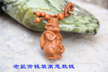 开光桃木剑工艺木雕风水桃木钥匙扣挂件十二生肖鼠老鼠背钱袋数钱