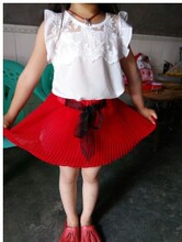2017夏款韩版女童装蕾丝拼接飞袖镂空雪纺背心T恤+雪纺短裙 套装
