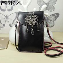 韩国新潮镶钻蜡油软皮拉链时尚手机包斜挎包女迷你小包包零钱包