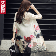 夏季薄款防晒衫女印花雪纺开衫防晒衣中长款时尚空调衫七分袖外套