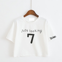 2017夏季韩版学院风 印花小字母宽松女学生高腰短款短袖T恤露脐装
