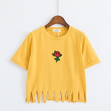 夏季新款韩版 刺绣玫瑰花下摆开叉流苏姐妹闺蜜装高腰短款短袖T恤
