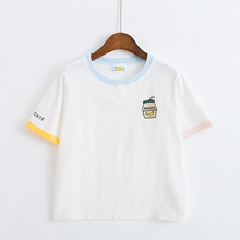 2017夏季韩版新款 刺绣香蕉瓶撞色袖宽松女学生短款短袖T恤打底衫