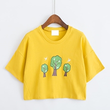 2017春夏新款韩版小清新 宽松植树印花女学生高腰短款短袖t恤女潮