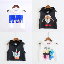 2017夏季新款韩版原宿风 潮流印花修身露脐装连帽短款无袖背心T恤