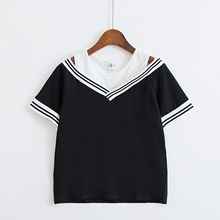2017春夏新款韩版瑞丽少女装休闲学院露肩假两件半袖上衣短袖T恤