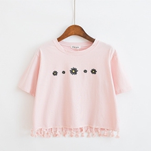 2017夏季韩版小清新 宽松高腰短款女上衣印小菊花下摆流苏短袖T恤