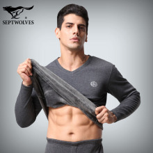 七匹狼男士V领保暖内衣套装加绒加厚冬季青年修身低领棉秋衣秋裤