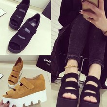 2015春夏新款单鞋女鱼嘴松糕厚底凉鞋魔术贴坡跟高跟洞洞罗马鞋子