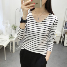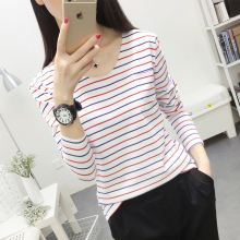 2016韩版新款潮流条纹V领长袖t恤女修身外穿打底衫卫衣女秋装