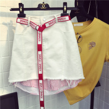 中高腰裙摆条纹拼接A字裙牛仔裙短裙女休闲腰带黑色白色2017春夏