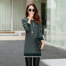 长袖针织衫女中长款秋冬新品时尚条纹打底衫韩版休闲圆领套头毛衣