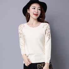 2016春季新品宽松套头打底衫针织衫蕾丝网纱袖毛衣女镂空上衣大码