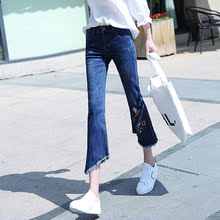 高腰刺绣牛仔裤女喇叭裤2017春夏显瘦修身七分毛斜边微喇7分裤潮