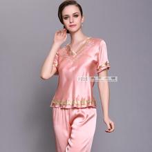 包邮 艺尔100%真丝睡衣 女士夏季家居服 V领 短袖中裤套装 2035