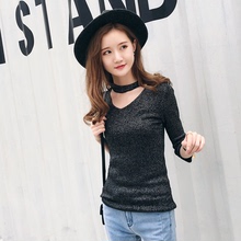 2017夏装新款韩版修身显瘦打底衫女 镂空挂脖冰丝针织上衣中袖T恤