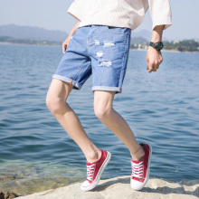 日系港风牛仔短裤男薄款破洞五分裤卷边半截刮烂中裤男士马裤潮牌