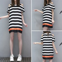 2017新款夏季韩版露肩显瘦条纹中长款简约百搭时尚修身连衣裙