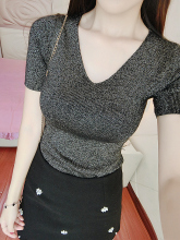 新款女装韩版秋季闪闪亮丝V领短袖针织衫修身显瘦弹力毛衣打底衫
