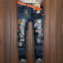 夏季男士牛仔裤潮流破洞乞丐小脚裤补丁长裤子男直筒修身图章